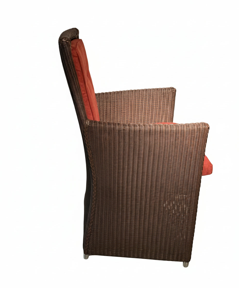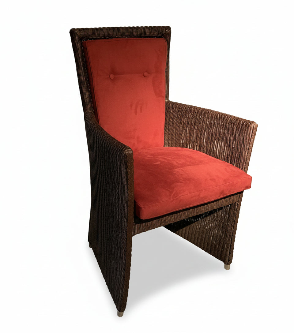 Kompakt, bequem, charakterstark: Der kleine Sessel 175 von Alvico Lloyd Loom kombiniert klassisches Loom-Geflecht in dunkelbraun mit einer weich gepolsterten Sitz- und Rückenpartie in Alcantara bordeaux. Das Ergebnis ist ein zeitloser Akzentstuhl – warm in der Anmutung, robust im Alltag, ideal für Wohn- und Essbereich, Flur oder Leseecke.