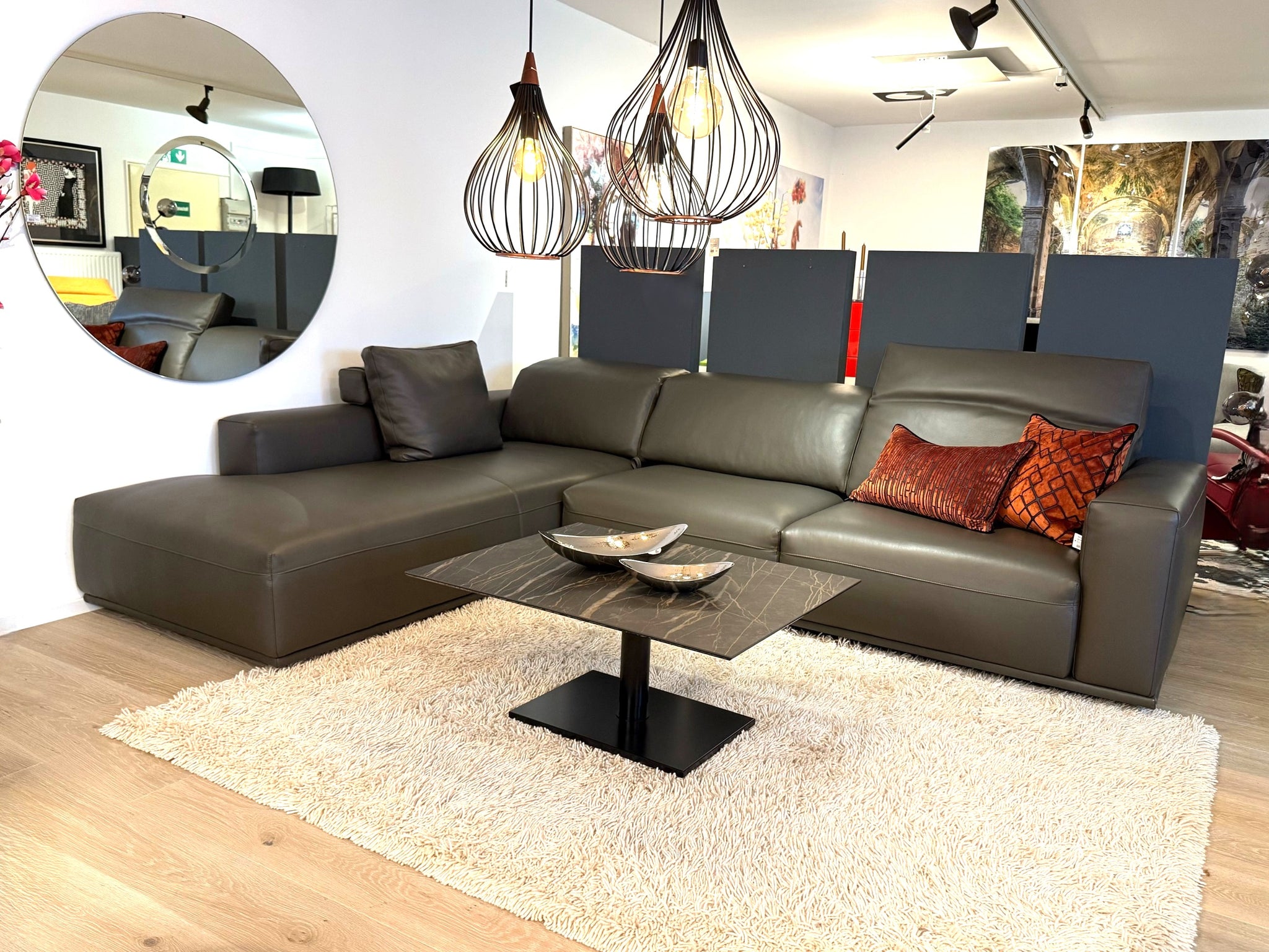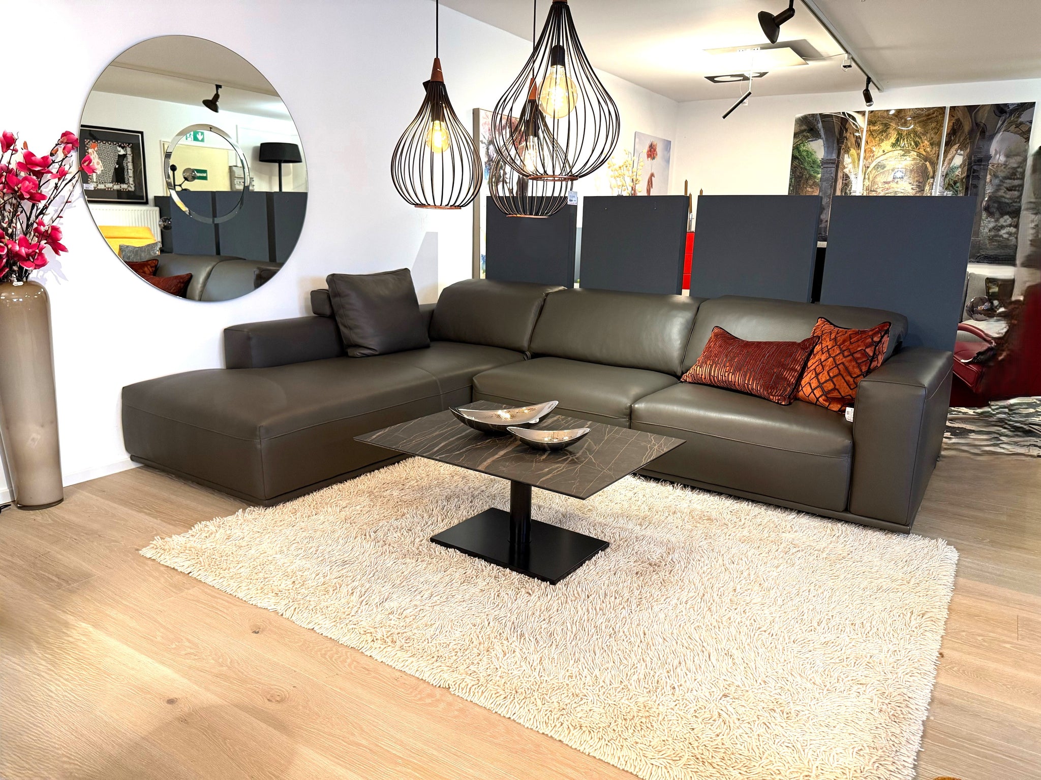 Design-Highlight mit Komforttechnik: Das Ecksofa Focus von Gyform kombiniert klare italienische Linien mit einem patentierten, einzigartigen Auszug-Mechanismus in den Sitzflächen. Das feine Seta Nappaleder „Terra“ (1,3–1,5 mm, leicht pigmentiert, natürliche Narbenstruktur) sorgt für eine edle Haptik und langlebige Qualität.