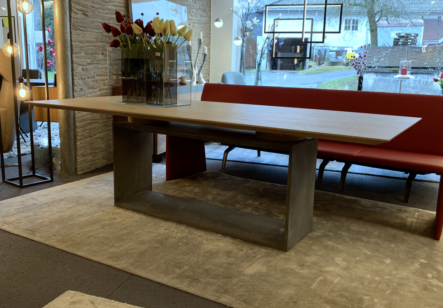 Puristische Architektur für den Essbereich: Der Asco Frame verbindet eine massive Eichenplatte mit Schweizer Kante und einem markanten Betonsockel in Dunkelgrau. Das Ergebnis ist ein skulpturaler Tisch mit ruhiger, moderner Ausstrahlung – langlebig, wertig und zeitlos kombinierbar.