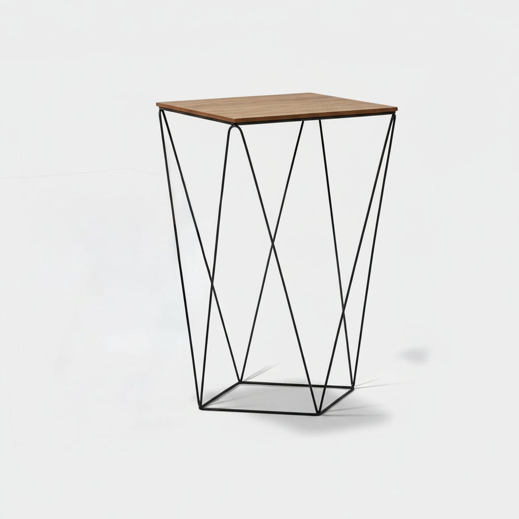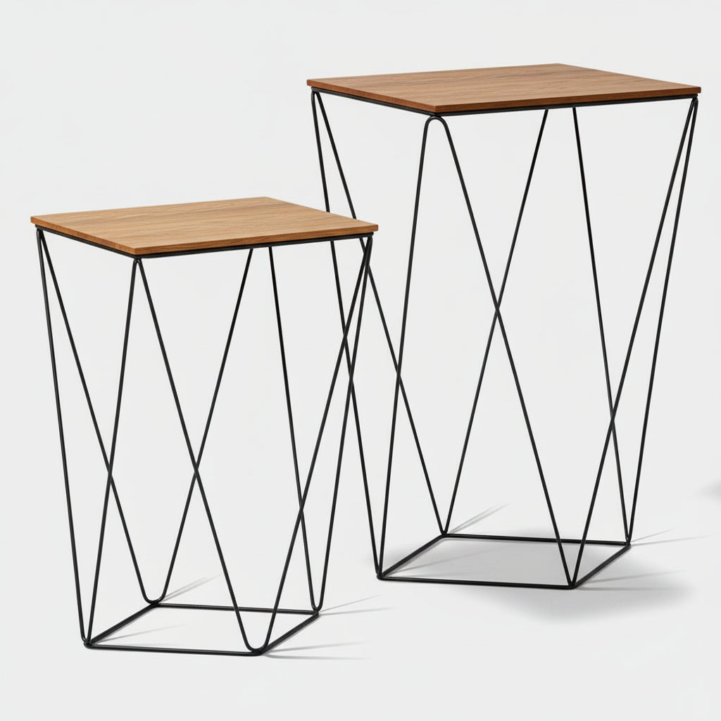 Maße: 30×30×48 cm (Drahthocker) · 36,5×36,5×60 cm (Beistelltisch)