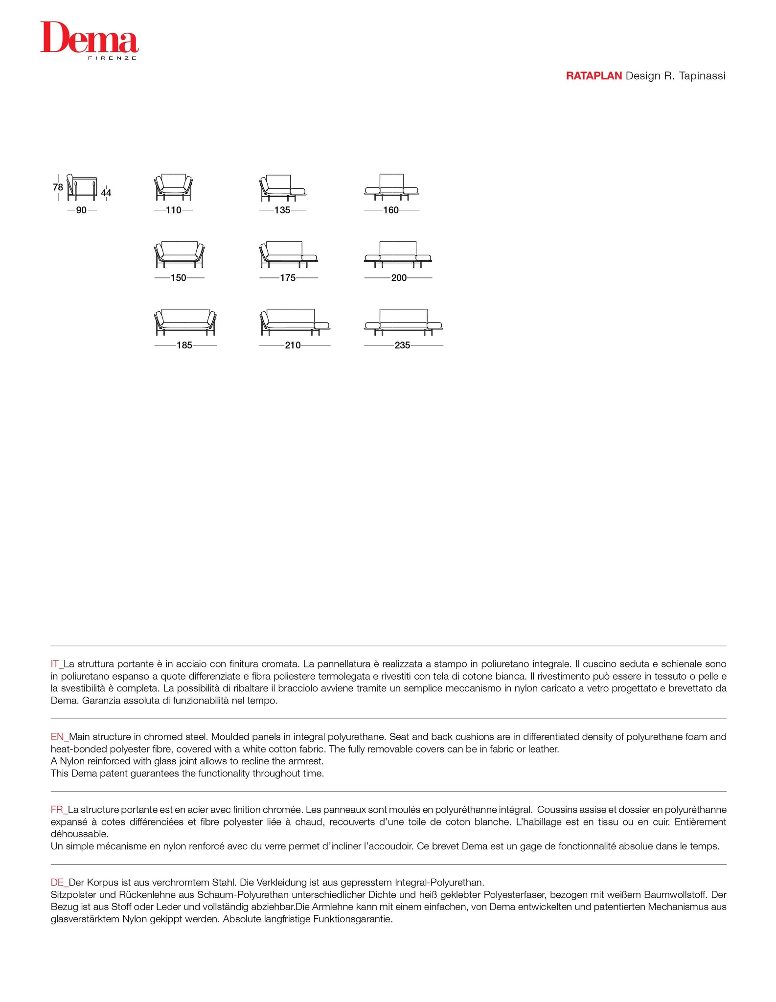 Der italienische Hersteller DEMA steht für höchste Qualität „Made in Italy“. Rataplan ist nicht nur ein Möbelstück, sondern Ausdruck zeitgenössischer Wohnkultur. Der langlebige Bezug, die sorgfältig ausgewählten Polstermaterialien und das klare Design machen das Sofa zu einem echten Highlight in jedem Raum.