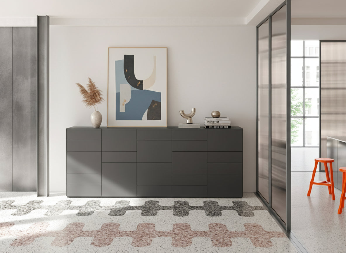 Kettnaker SOMA Highboard im Wohnambiente – 6 Türen à 60 cm, Lack matt anthrazit