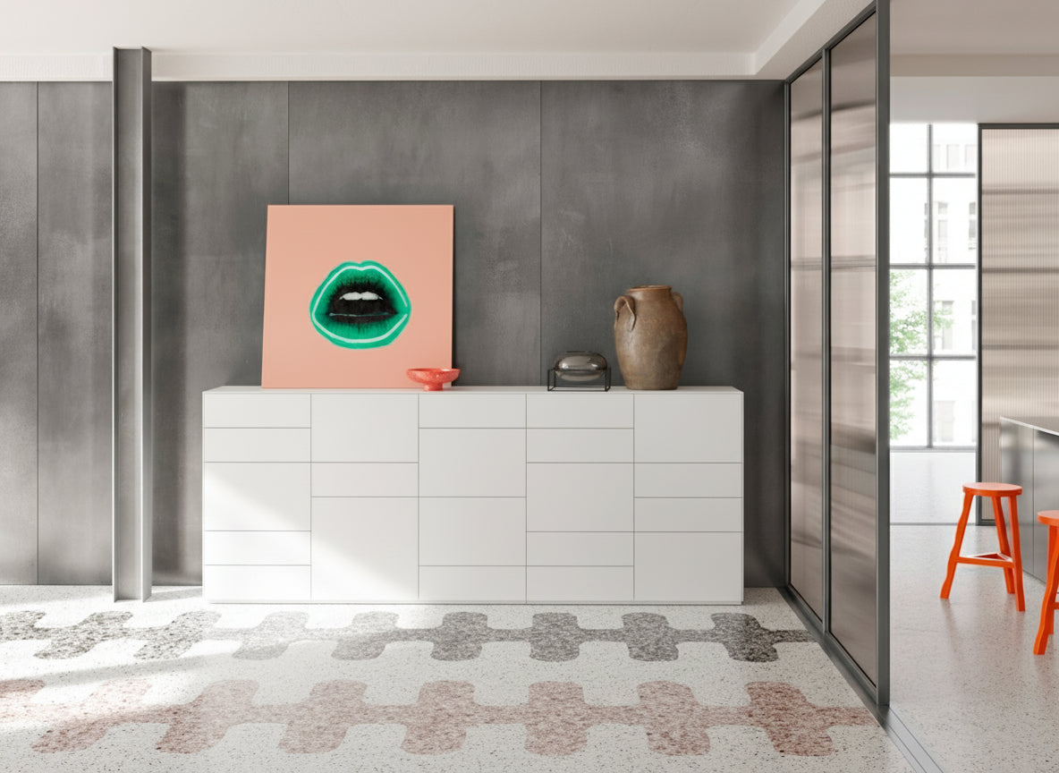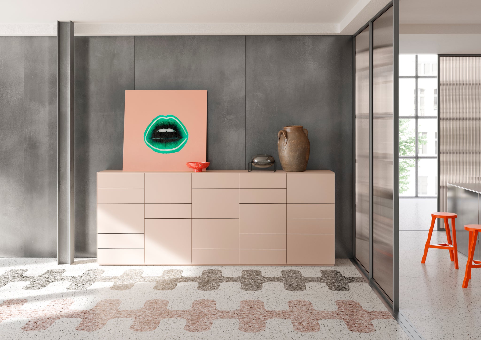 Die Abdeckplatte sowie alle Sichtelemente sind in Lack matt ausgeführt und lassen sich – typisch SOMA – farblich frei konfigurieren. Innen schafft jedes Element mit zwei Einlegeböden aus Weißglas großzügig gegliederten Stauraum für Geschirr, Bücher, Bar- oder Medienutensilien.
