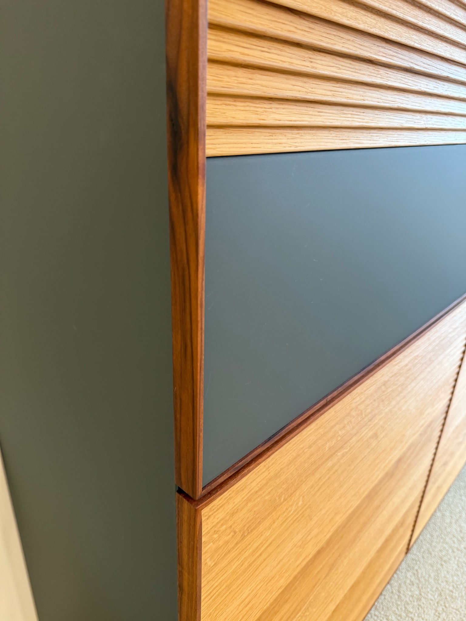 Handwerk trifft Architektur: Der Geschirrschrank TRATUM überzeugt mit markanter Lamellenstruktur, matten Glaselementen in Dunkelgrau und einer eleganten Kontrastleiste aus Nussbaum. Hinter präzise gearbeiteten Türen verbirgt sich viel Stauraum – inkl. Bareinteilung links und verspiegelter Rückwand mit Gläserfächern. Ein Statement für Ess- und Wohnbereiche.