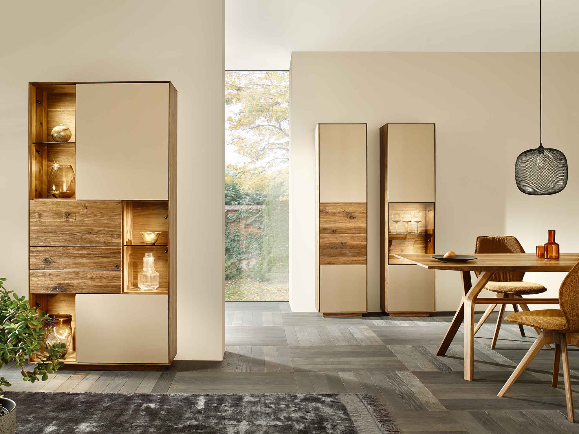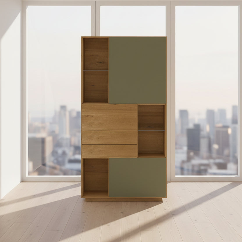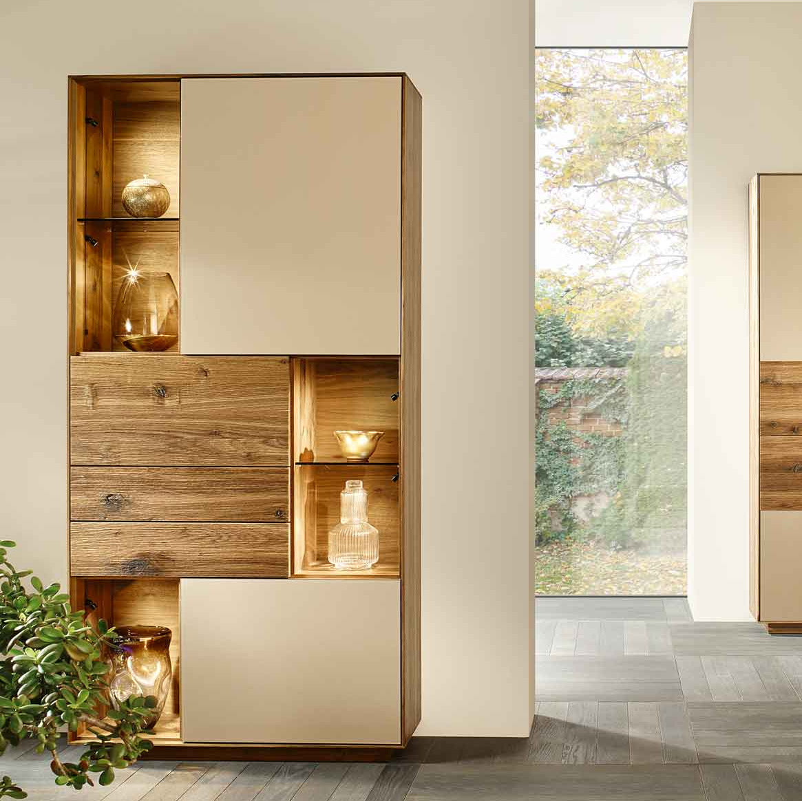 B/H/T 98,1 × 198,6 × 35 cm • auf 5-cm-Sockel • 2 MDF-Türen lackiert • 1 Tür & 2 Schubladen in Asteiche/Astnuss mit Zopfbürstung • 3 offene Nischen (beleuchtbar)