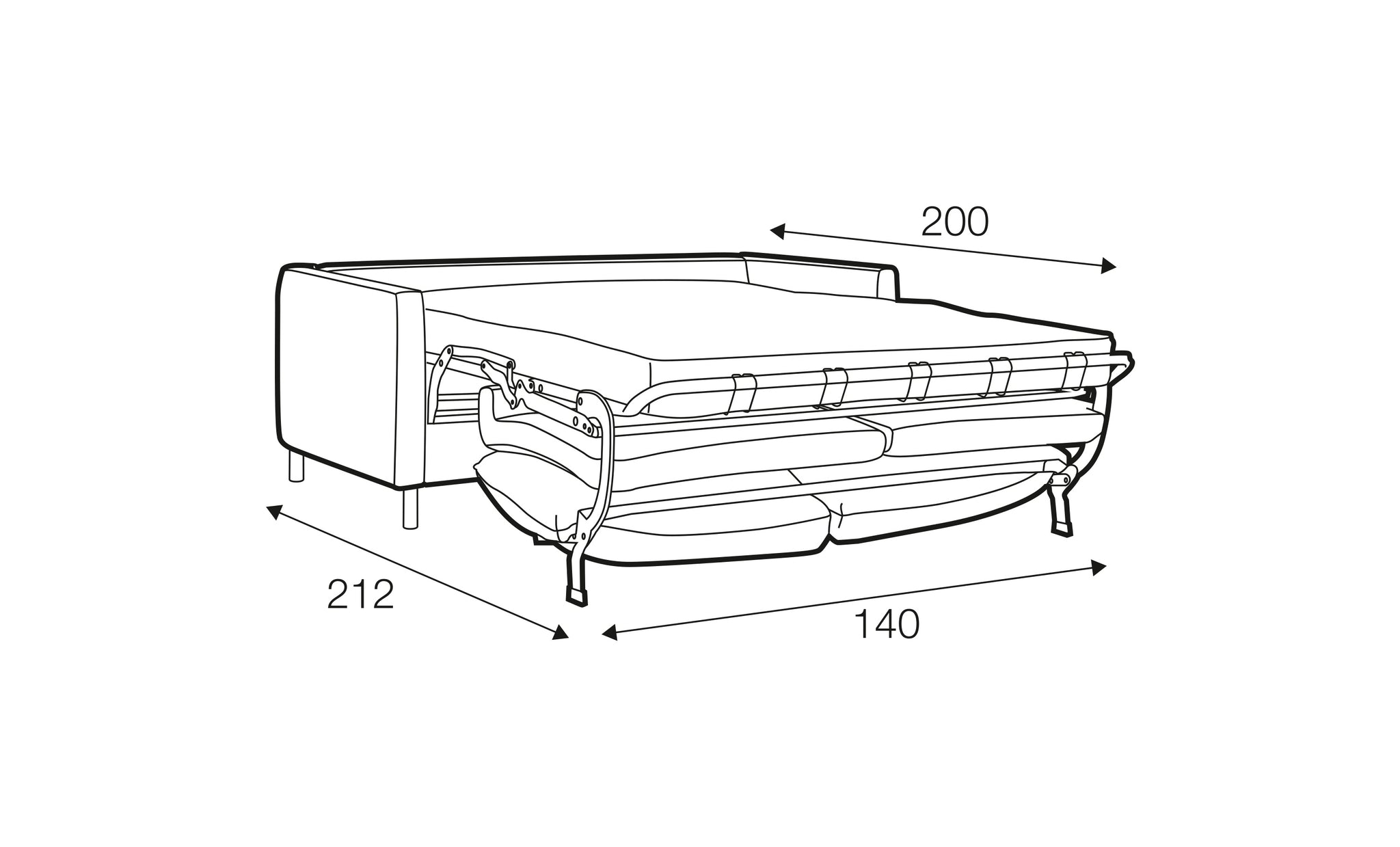 Liegefläche: 140 × 200 cm, ausgeklappt Gesamttiefe 212 cm.